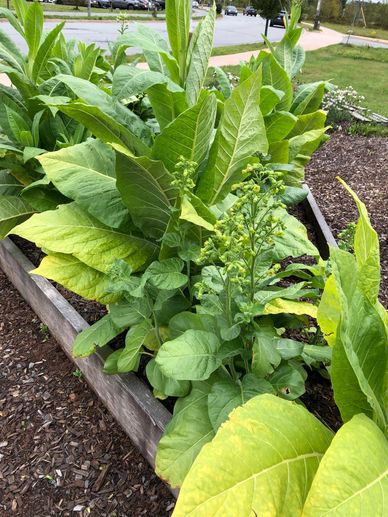 East of the medicine wheel, tobacco is an annual plant and its leaves are used for spiritual purposes such as praying, ceremony and sacred pipe. Our garden is transitioning from commercial tobacco to more traditional tobacco, with lower height and smaller size leaves. Tobacco leaves and seeds from flowers are collected each fall. Tobacco leaves are dried to be sent to local indigenous groups and seeds are used for the next year.